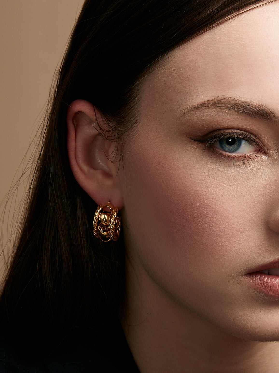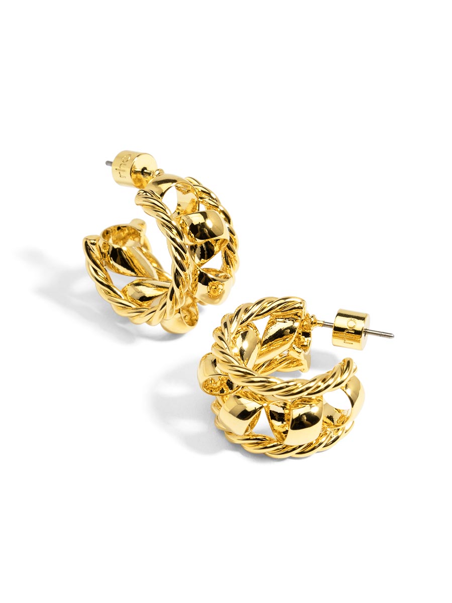 Small huggie earring plated in 18K gold, featuring ribbon and braid embellishments.