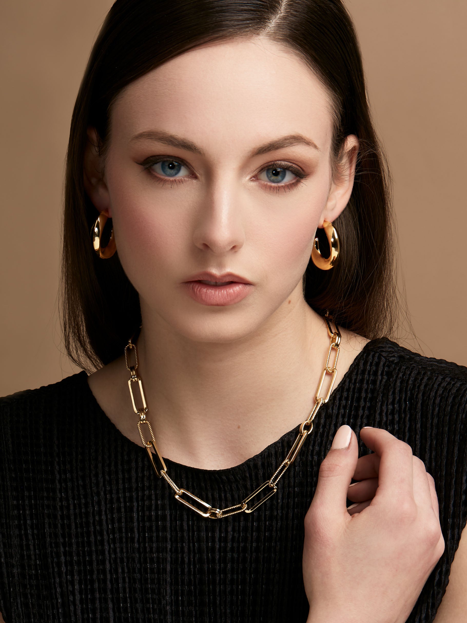 Chunky 18K gold-plated open hoop earring in a C shape.