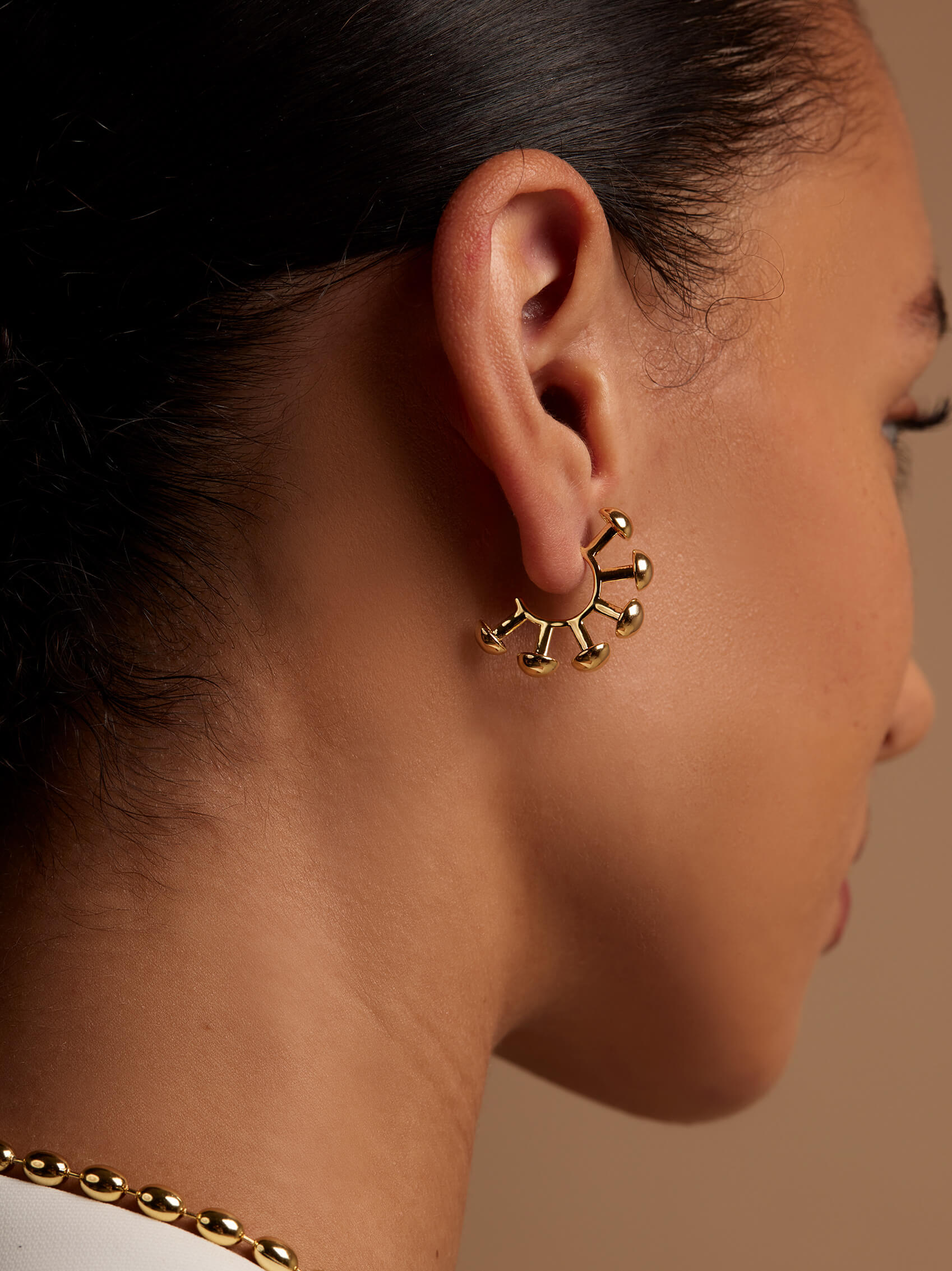 18K gold-plated hoop earrings feature a half circle with a rich, textured surface that catches and reflects light beautifully.