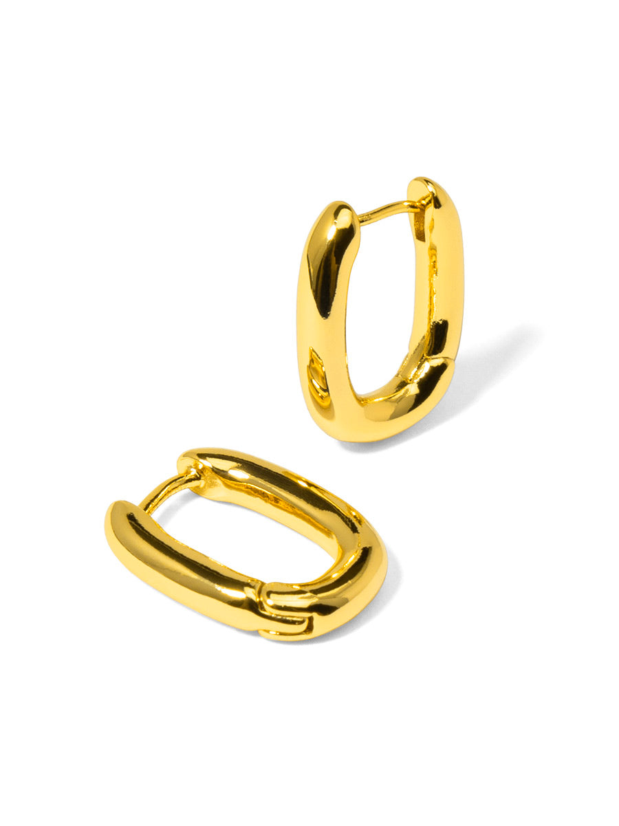 Medium, thick brass-based huggie earring in U-shape, plated in 18K gold.