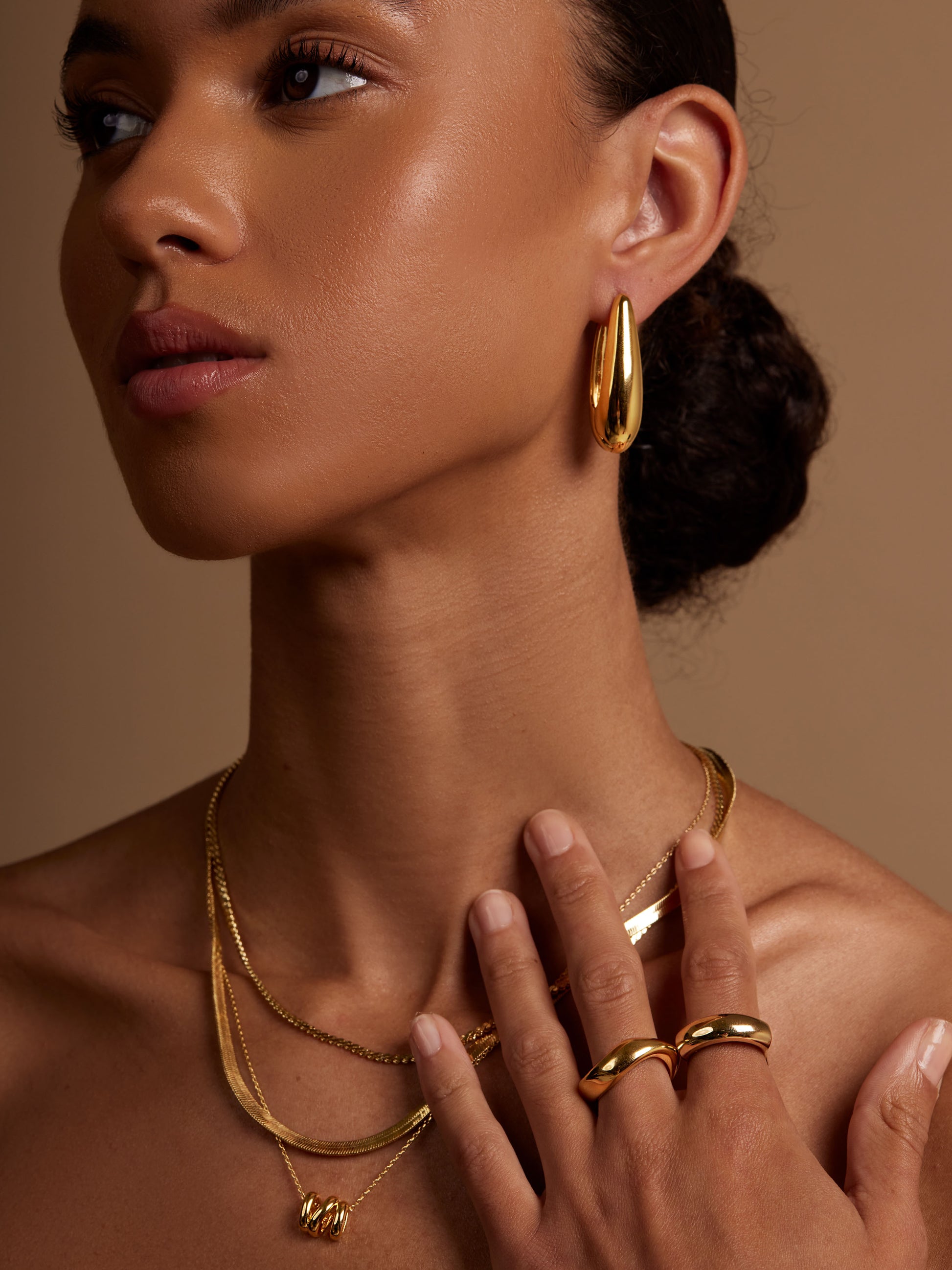 Oversized teardrop shaped hoop earring triple plated in 18K gold.