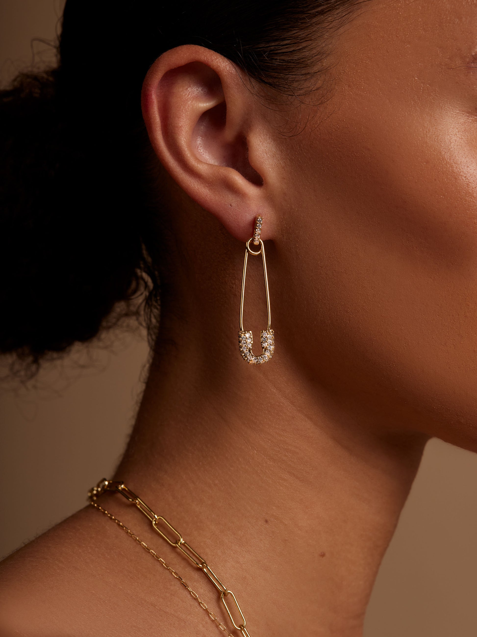 18K gold-plated drop earrings featuring a safety pin design encrusted with sparkling cubic zirconia stones.