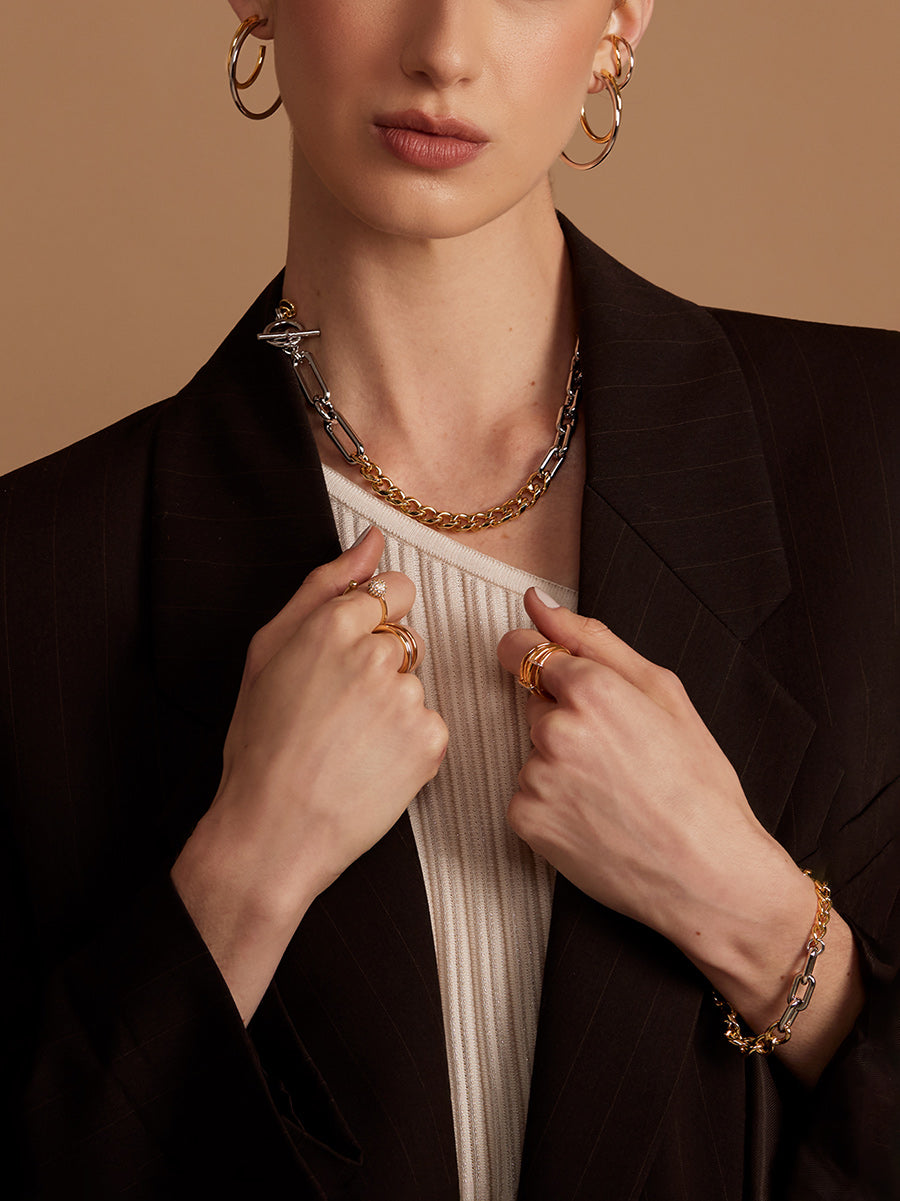 18K gold-plated toggle bracelet designed with paperclip, oval and curb chain links.