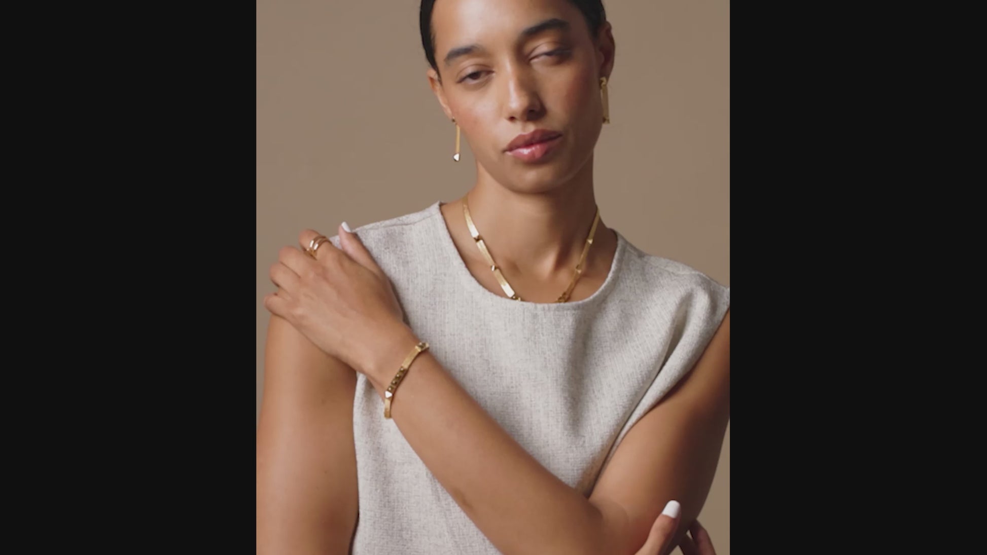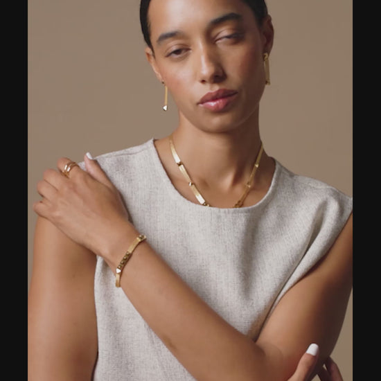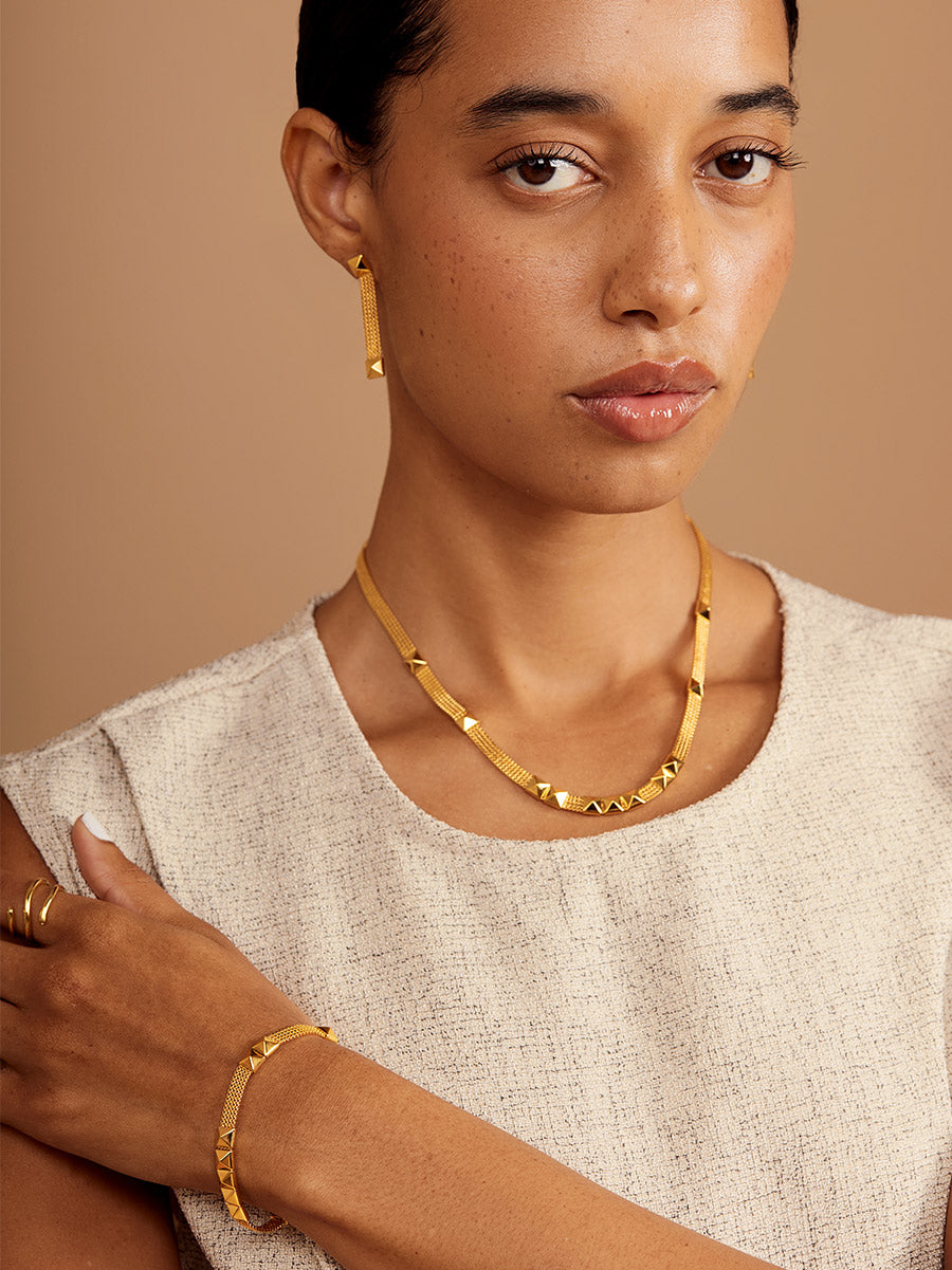 A modern bracelet combining flexible mesh texture with polished pyramid studs. A foldover clasp ensures a seamless fit.