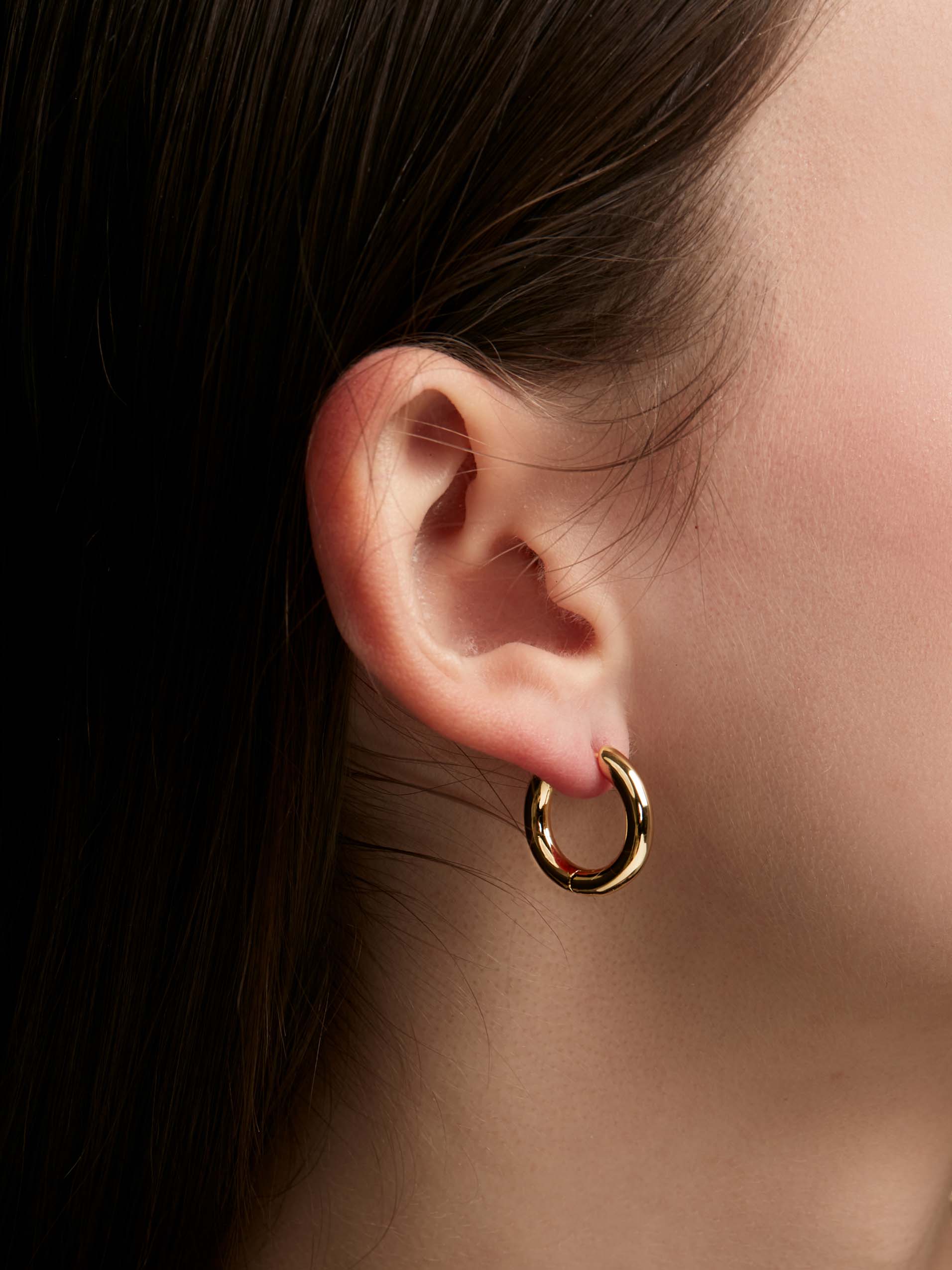 Small, thick brass-based huggie earring plated in 18K gold.