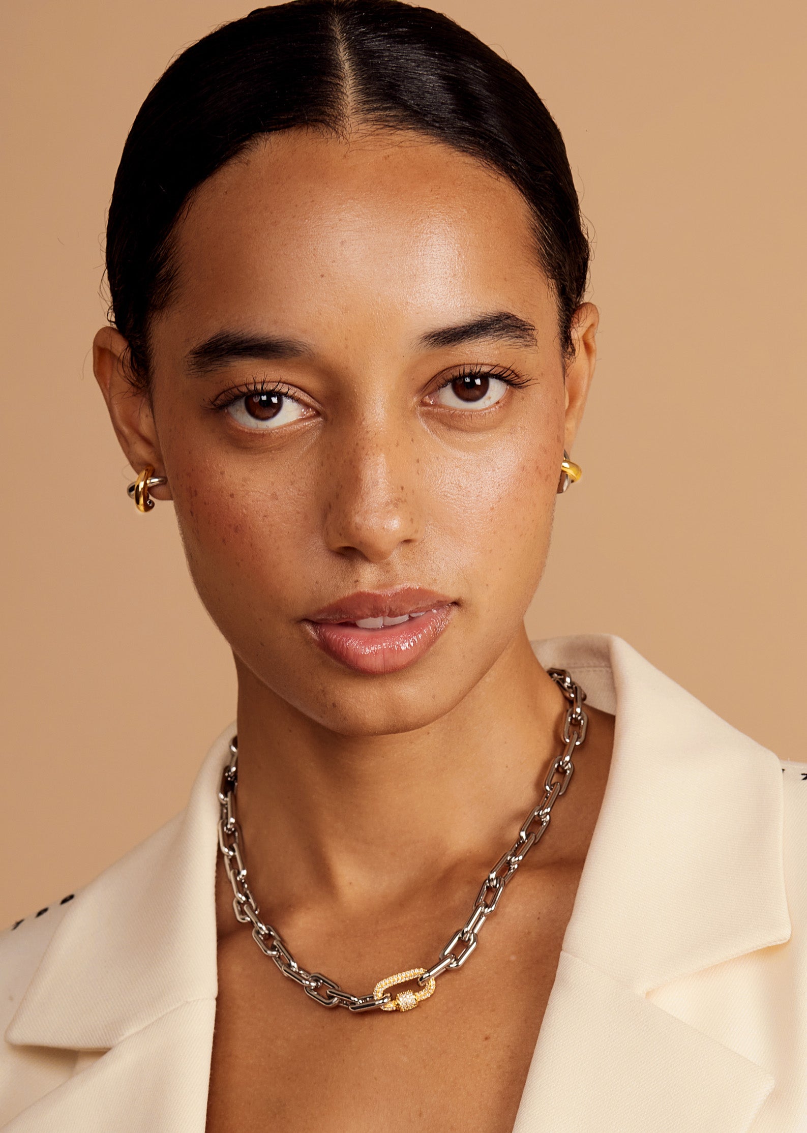 Mixed-metal short necklace featuring a bold silver-tone chain and a gold-tone carabiner-style charm encrusted with pavé crystals. A magnetic clasp completes the sleek, utility-inspired design.