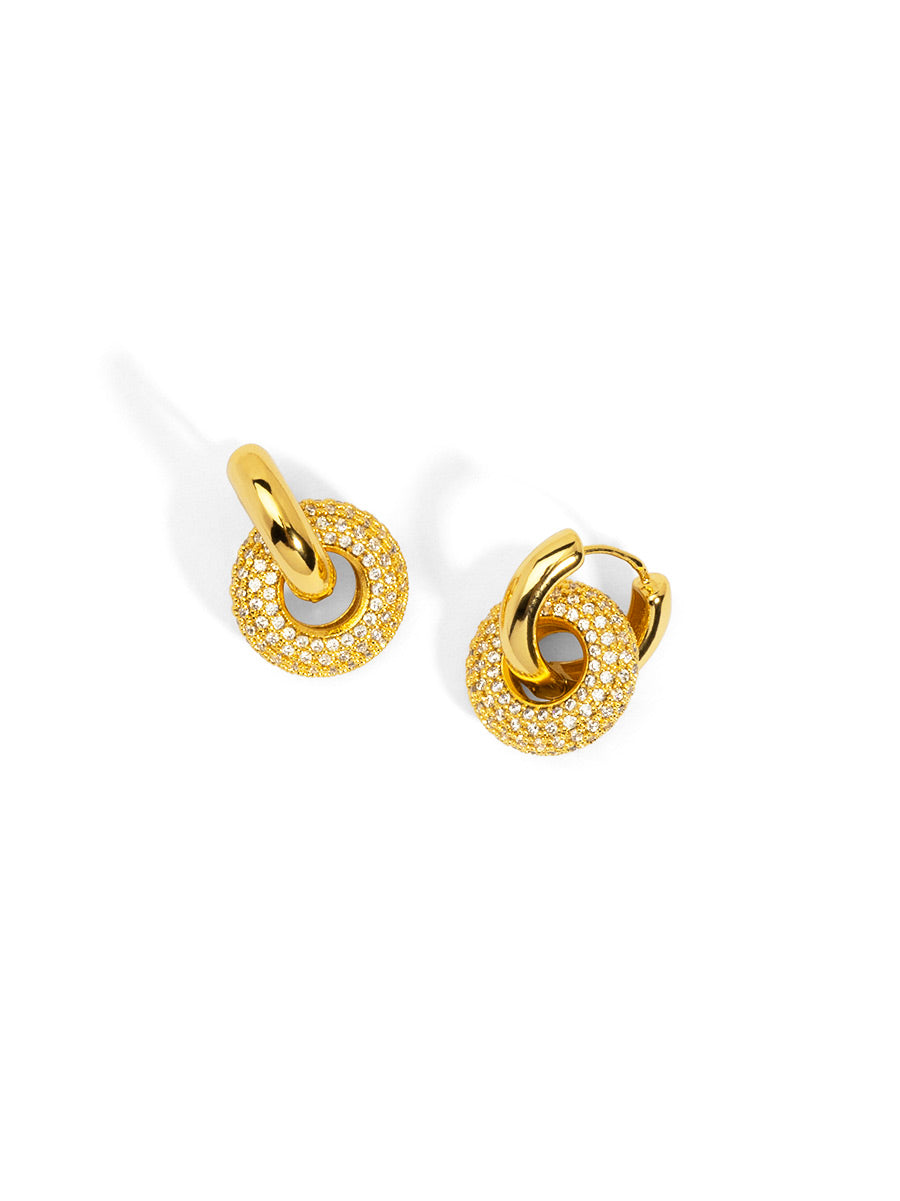 Drop earrings feature two interconnected round links, one with pavé-set stones for added sparkle.