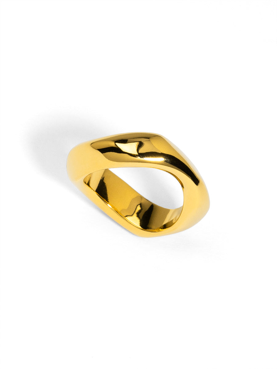 18K gold-plated ring features a sleek, sculptural design with a subtle twist at the center.